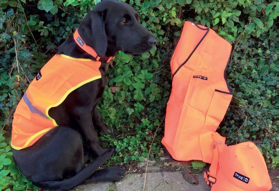 Du kan bestille orange sikkerhedsbånd til hatten, cap, vest, hundehalsbånd og hundesikkerhedsvest, alt sammen i de størrelser, der passer dig og din hund.