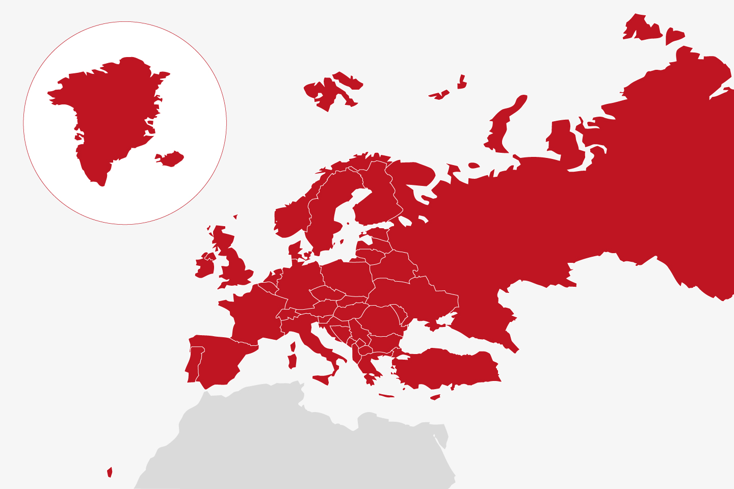 - Det geografiske Europa, Færøerne, Grønland, Storbritannien, Irland, Malta, De kanariske øer, Azorerne, Madeira samt hele Tyrkiet og hele Cypern.